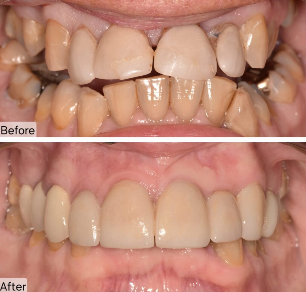 The patient was frustrated with her fractured front crowns and an uncomfortable, ill-fitting partial denture that moved while eating and speaking. She wanted natural-looking restorations that blended seamlessly with her existing teeth and were age-appropriate.