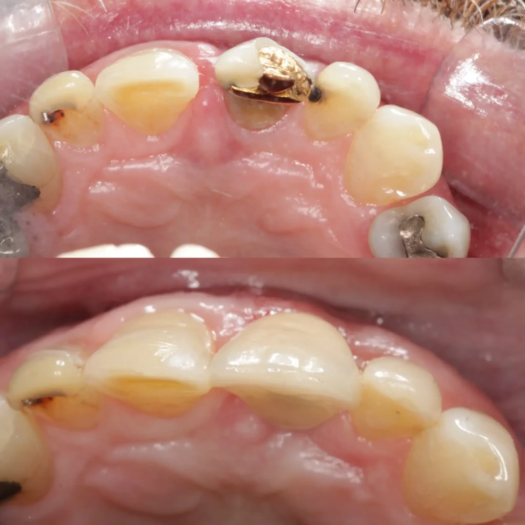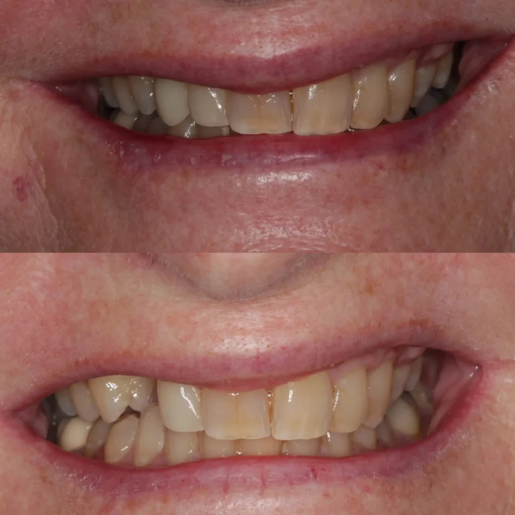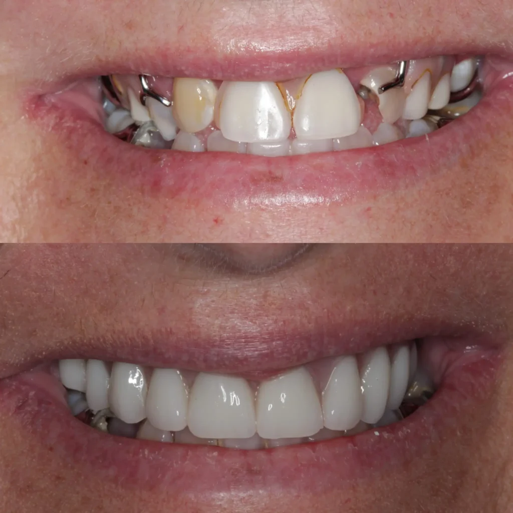 The patient was frustrated with her fractured front crowns and an uncomfortable, ill-fitting partial denture that moved while eating and speaking. She wanted natural-looking restorations that blended seamlessly with her existing teeth and were age-appropriate.